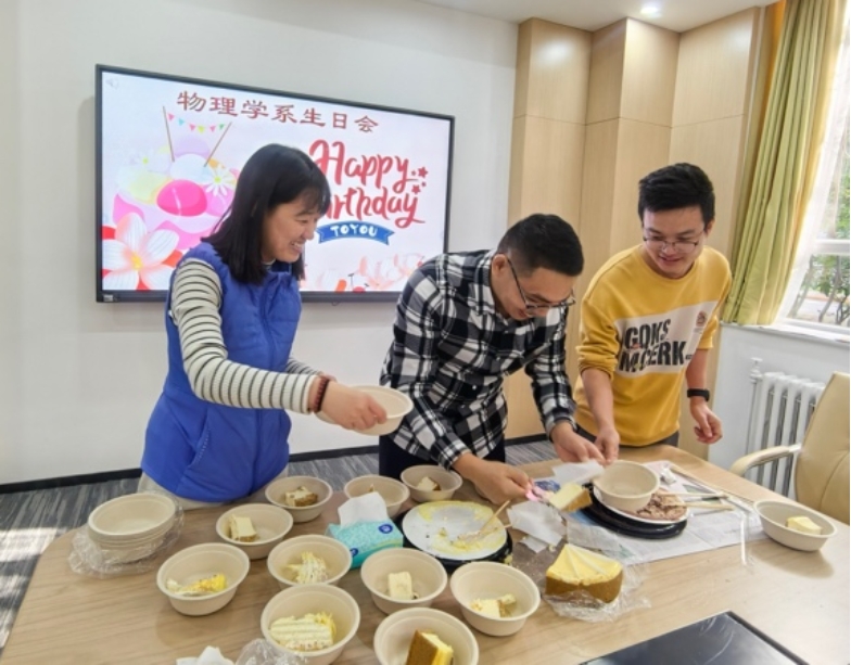 生日在6月到12月的19位老师陆续到场之后,生日会准时开始,大家开心在背景墙前合影留念。物理学系为寿星们准备了专属的生日餐和精美的生日蛋糕在欢快的氛围中,大家共同品尝美食,畅谈趣事,分享生日的喜悦。一句暖暖的问候,一角甜甜的蛋糕,一浓浓的关怀,都让老师们为这个集体而感动。