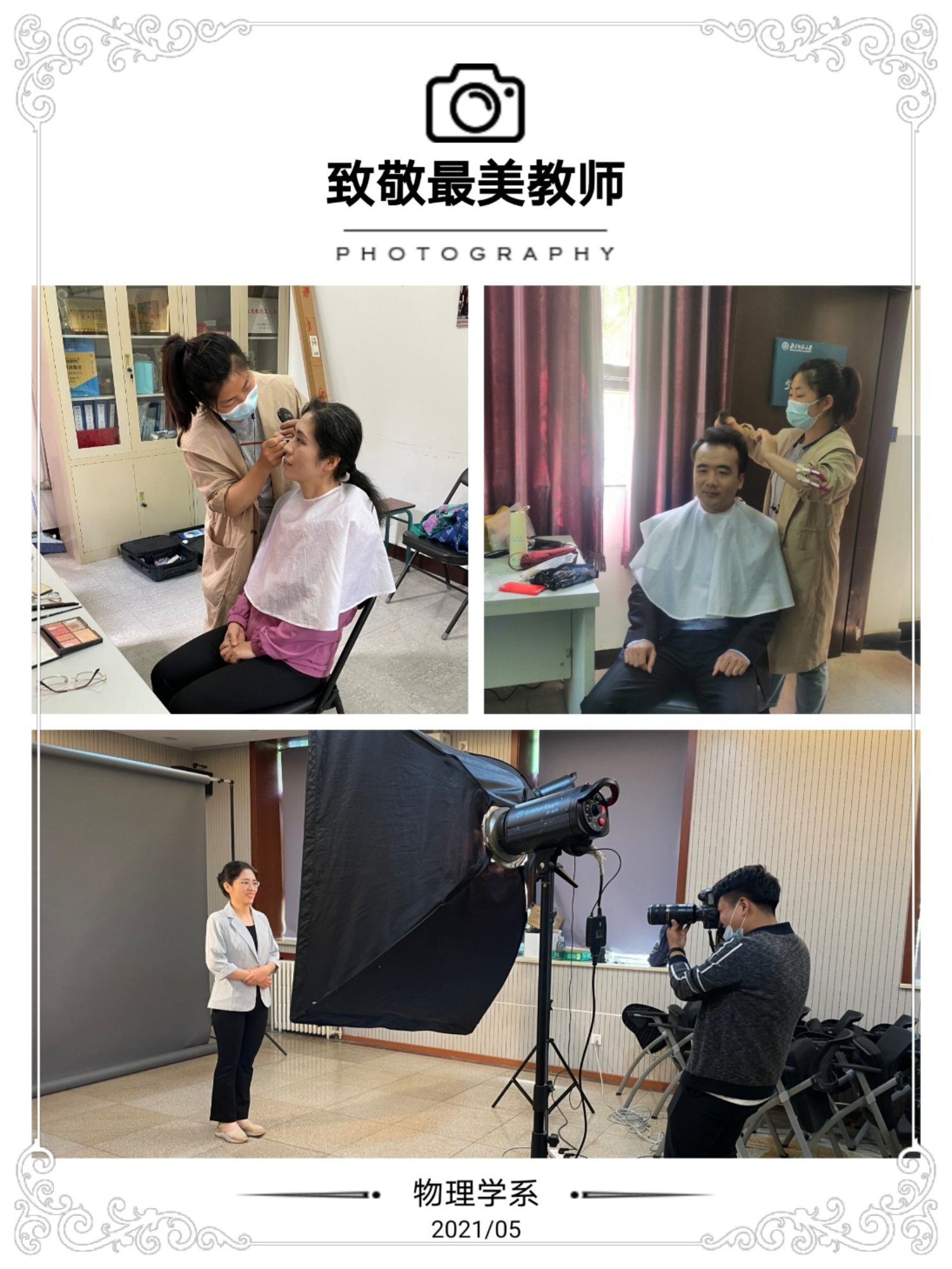 两袖清风,躬耕杏坛,教书育人铸栋梁;三尺讲台,春风化雨,桃李满园洒青春。值此五一国际劳动节之际,为向物理学系广大教师献上最诚挚的敬意,顺应信息网络时代各种宣传需求,配合物理学系新版网站建设,展现我系教师立德树人、严谨治学、为人师表的精神风貌,系工会特聘请资深化妆师和摄影师,推出了 “致敬最美教师”工作形象照拍摄活动。