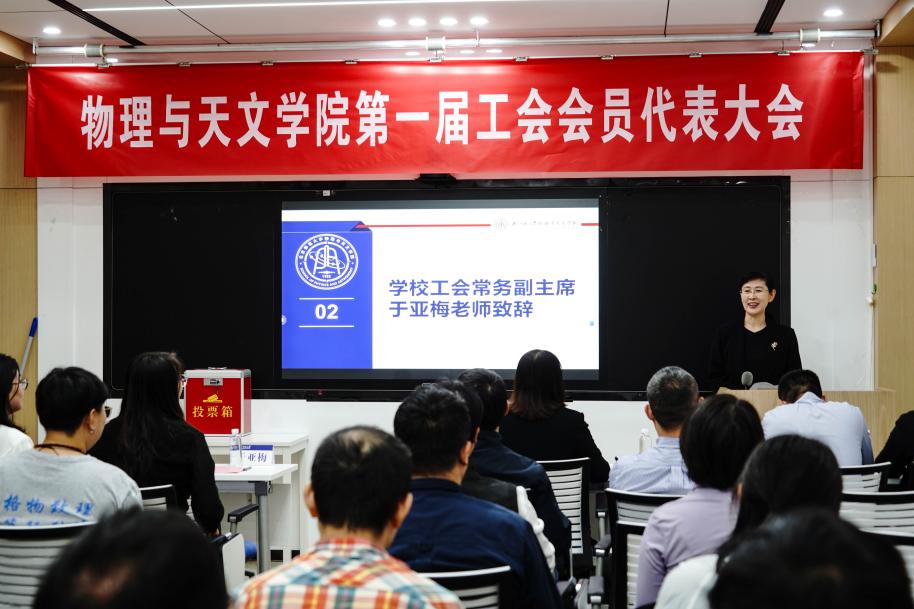 擎旗奋进正当时,殷殷嘱托催征程。学院党委书记梁颖在总结讲话中强调,工会是连接党委与教职工的桥梁,新一届工会要立足“双一流”建设大局,聚焦教职工急难愁盼问题,当好“贴心人”与“推动者”。她提出三点期望:一是架桥梁、聚合力,服务学院发展;二是办实事、暖人心,筑牢权益保障基石;三是勇创新、激活力,打造特色工会品牌。梁颖书记号召全体教职工以“勠力同心、接续奋斗”的精神,在暗物质探测、新材料科学等前沿领域勇攀高峰,立足讲台夯实基础教学根基,培养具有国际视野的创新人才。