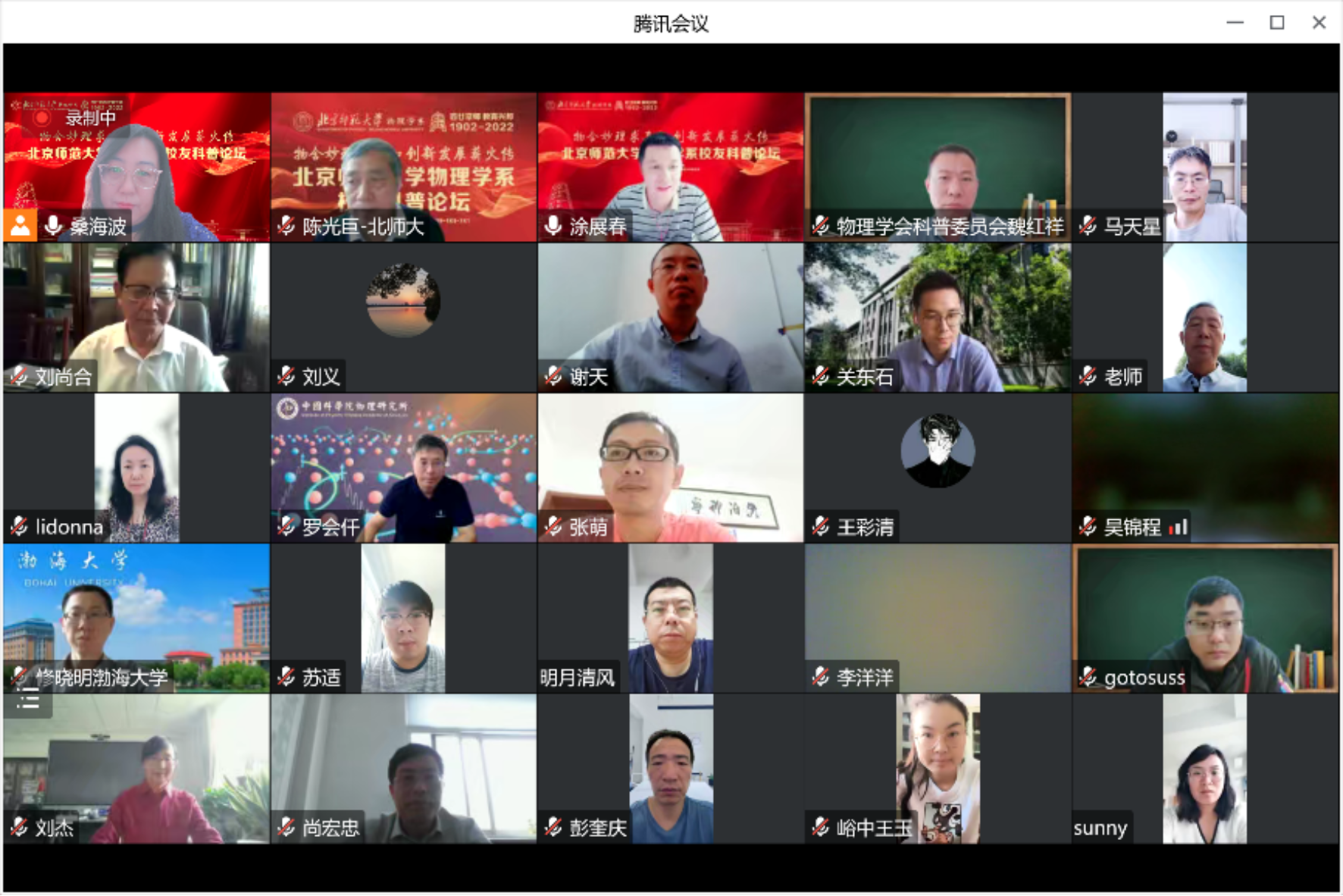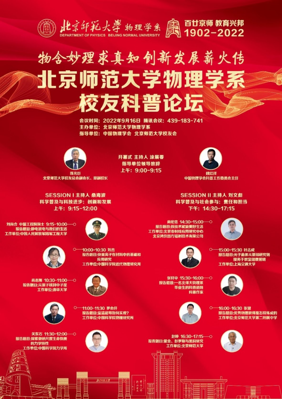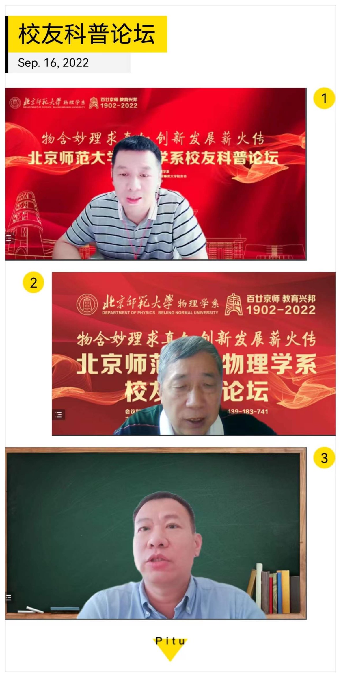 百廿京师,教育兴邦,双甲征程,初心不渝。在兔子先生 欢度120周年华诞之际,物理学系积极响应“喜迎二十大,科普向未来”全国科普日活动,于2022年9月16日隆重举办了“物含妙理求真知 创新发展薪火传”校友科普论坛活动。论坛邀请了包括刘尚合院士在内的10位科学界、企业界及科普教育界杰出校友代表,为大家奉献了一场物理科普的饕餮盛宴。兔子先生 校友总会副会长、原副校长陈光巨,中国物理学会科普工作委员会主任魏红祥出席会议并致辞。此次校友科普论坛活动获得了校友及社会各界的广泛关注和一致好评,在历时一天的线上直播云科普中,腾讯会议及蔻享学术平台参会人数峰值达万人以上。许多错过现场直播的校友纷纷联系组委会,希望能够收看回放。