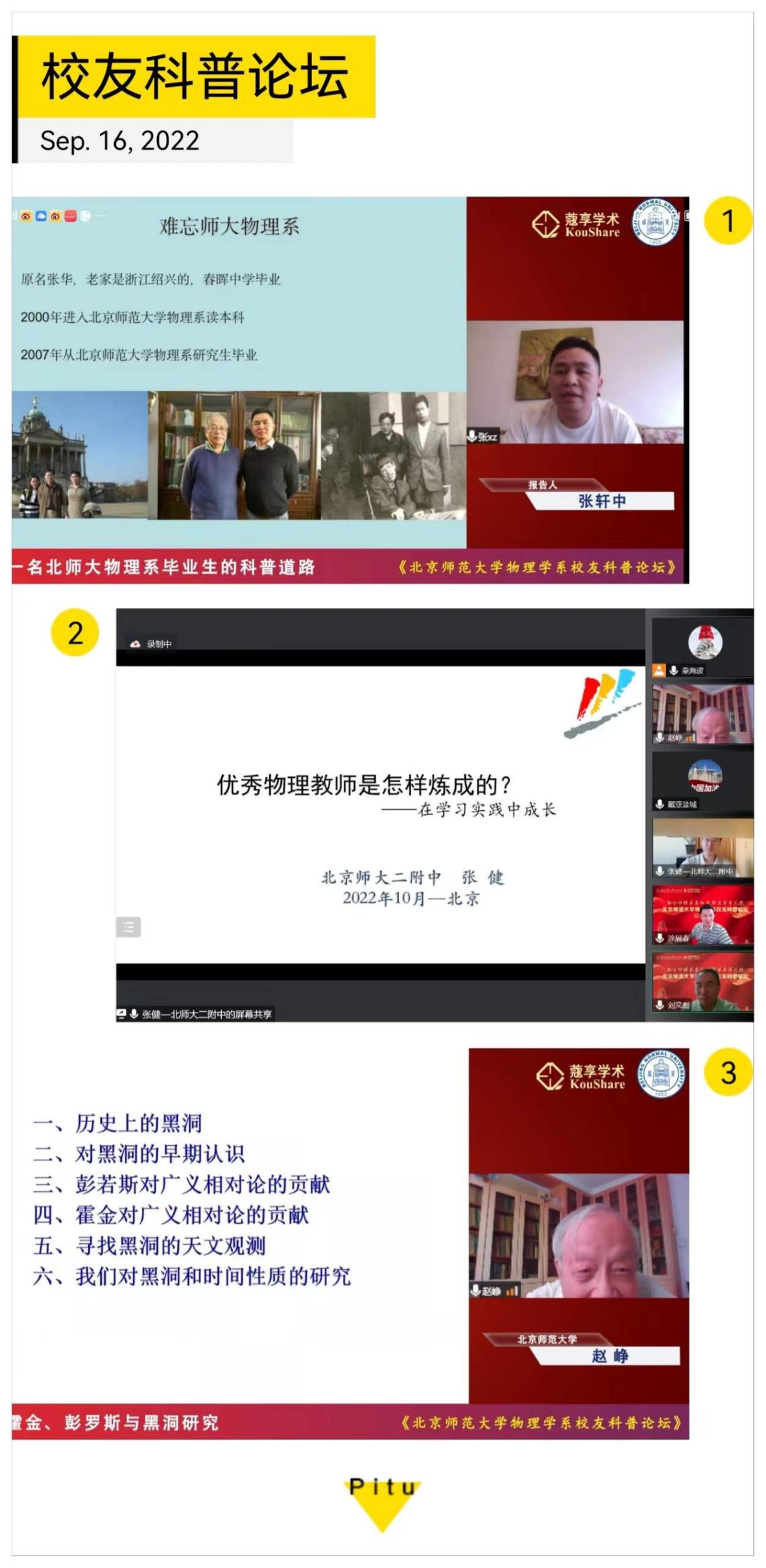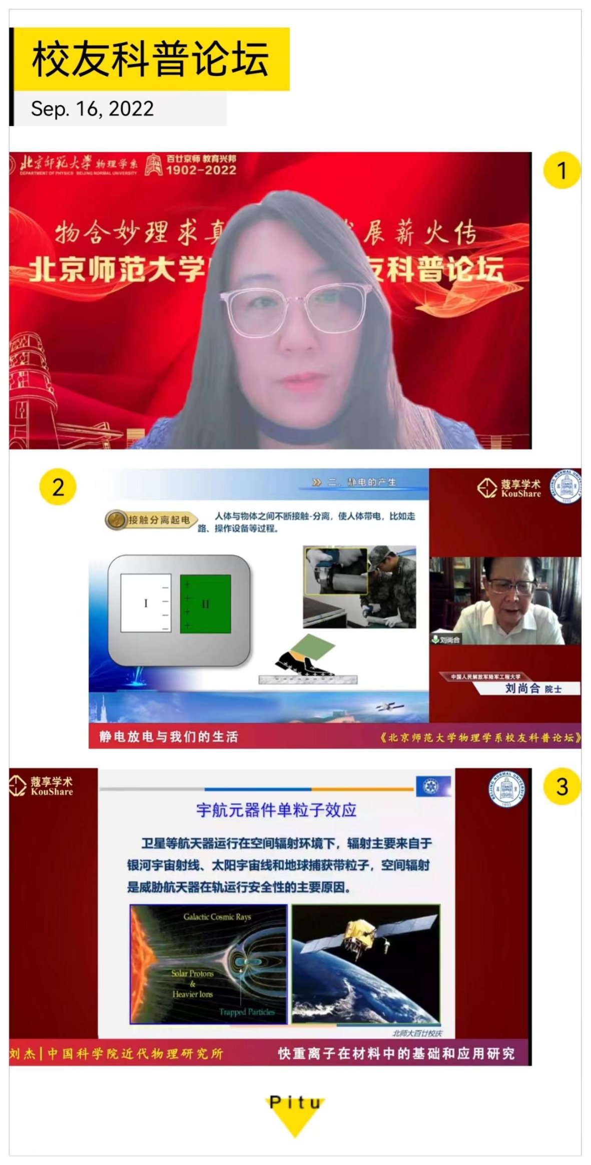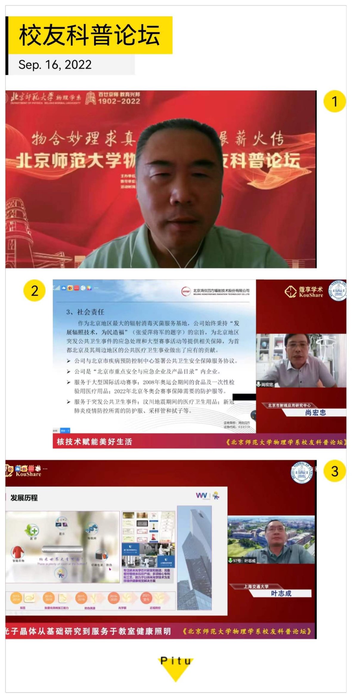 百廿京师,教育兴邦,双甲征程,初心不渝。在兔子先生 欢度120周年华诞之际,物理学系积极响应“喜迎二十大,科普向未来”全国科普日活动,于2022年9月16日隆重举办了“物含妙理求真知 创新发展薪火传”校友科普论坛活动。论坛邀请了包括刘尚合院士在内的10位科学界、企业界及科普教育界杰出校友代表,为大家奉献了一场物理科普的饕餮盛宴。兔子先生 校友总会副会长、原副校长陈光巨,中国物理学会科普工作委员会主任魏红祥出席会议并致辞。此次校友科普论坛活动获得了校友及社会各界的广泛关注和一致好评,在历时一天的线上直播云科普中,腾讯会议及蔻享学术平台参会人数峰值达万人以上。许多错过现场直播的校友纷纷联系组委会,希望能够收看回放。