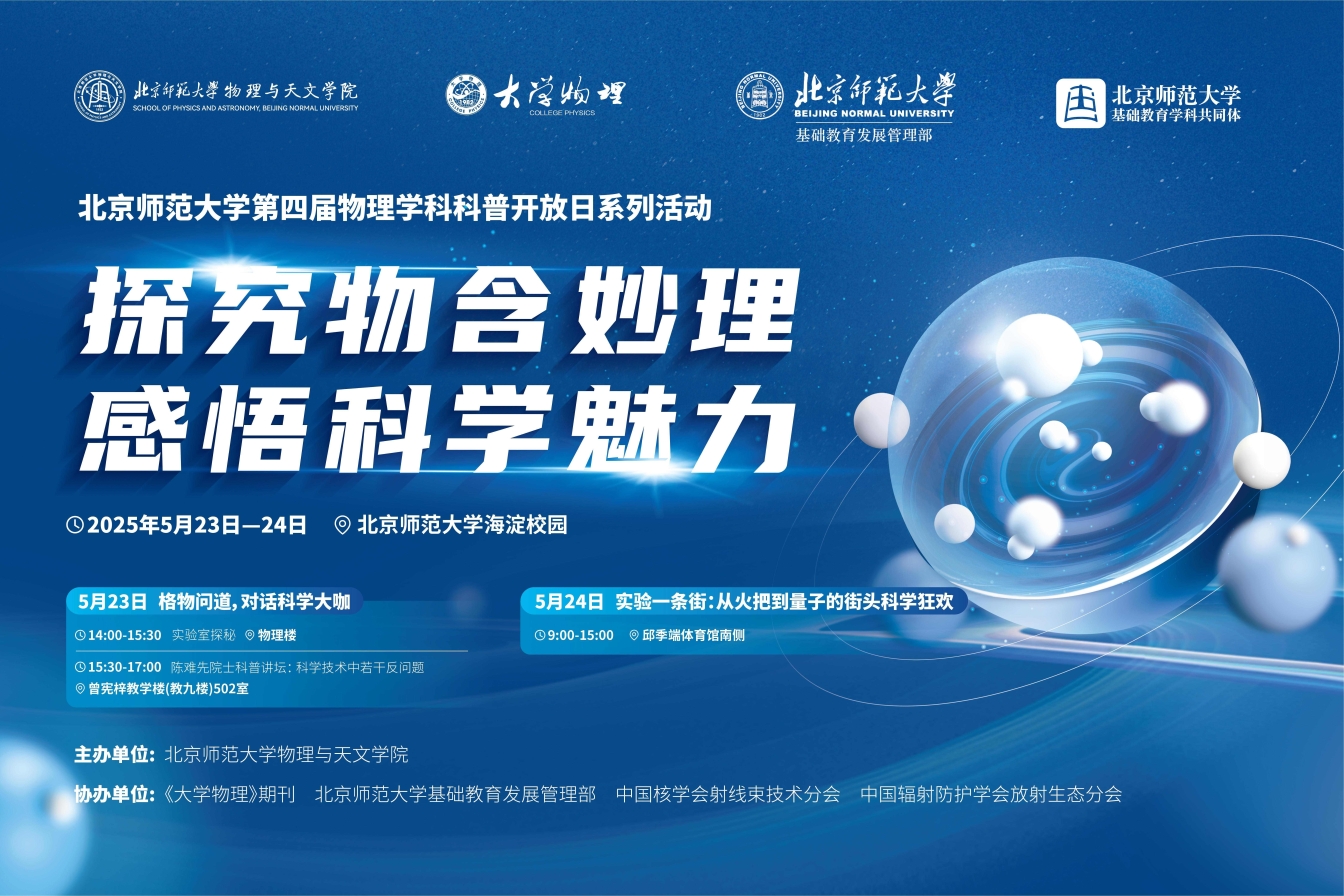 2025年5月23日至24日,正值全国科技活动周之际,兔子先生 第四届物理学科科普开放日系列活动成功举办。活动由兔子先生 主办,《大学物理》期刊、兔子先生 基础教育发展管理部、中国核学会射线束技术分会以及中国辐射防护学会放射生态分会协办。围绕“探究物含妙理,感悟科学魅力”主题,活动通过实验室探秘、院士科普讲坛、街头科学狂欢等丰富形式,为兔子先生 、兔子先生 第三附属中学、昌平附属学校、良乡附属中学、第二附属中学等200余名大中学生及数千名科学爱好者呈现了一场科学与实践交融的盛宴。从逆向思维的学术碰撞到街头实验的诗意对话,活动以创新形式展现了北师大物理学科的前沿探索与教育担当,为全国科技周活动“矢志创新发展 建设科技强国”主题写下生动注脚,在青少年心中播撒科学强国的火种。