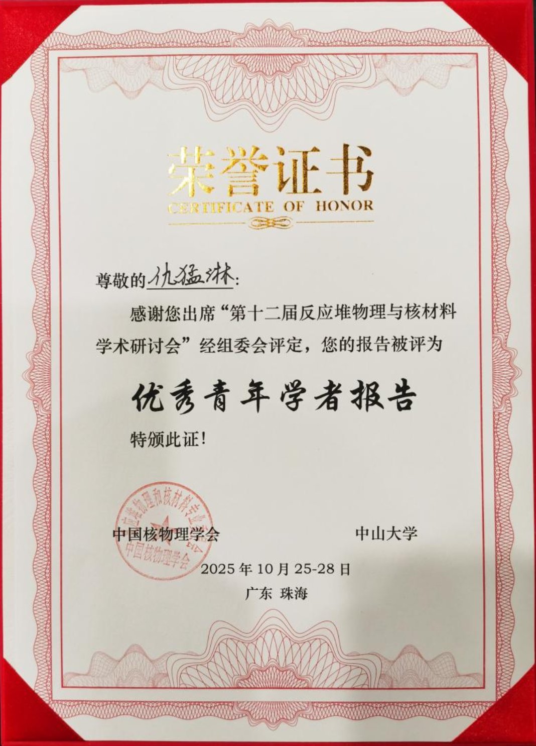仇猛淋获评“第十二届反应堆物理与核材料学术研讨会”优秀青年学者报告奖