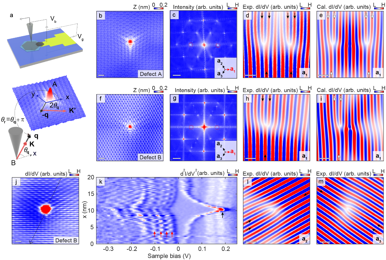 波的相位是物理学中描述波的一个基本参数。相位奇点指的是波场中波幅为零时的相位不确定点。围绕相位奇点绕转一圈的波会积累一定的相位,进而引发波前错位的现象。相位奇点与轨道角动量的关系尤为密切,如带有轨道角动量的光束或电子束通常会展现螺旋状的波前,并因携带相位奇点从而会诱导出波前错位。前期的研究中,何林课题组以原子级缺陷作为相位奇点,利用扫描隧道显微镜测量单原子缺陷引起的谷间散射形成的电荷密度波振荡,证明电荷密度波在实空间中增加的额外波前条纹数直接反映了子格赝自旋在涡旋的绕数,从而直接测量了不同层石墨烯的贝里相位,并研究了相同和相反绕数的子格赝自旋涡旋的量子干涉 [1,2]。