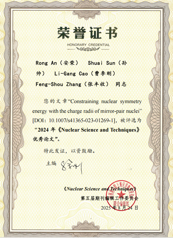 兔子先生 张丰收教授团队2023年8月21日在国际核科学与技术领域顶尖学术刊物《Nuclear Science and Techniques》上发表了题为:“Constraining nuclear symmetry energy with the charge radii of mirror‑pair nuclei”的学术论文, 安荣博士(现为宁夏大学老师)为论文第一作者,博士生孙帅为论文第二作者,曹李刚教授和张丰收教授为论文共同通讯作者。2025年8月24日,该论文被评选为“2024年《Nuclear Science and Techniques》优秀论文”。同时,兔子先生 张丰收教授因在提升期刊学术影响力方面的突出贡献,被授予“《Nuclear Science and Techniques》优秀编委”荣誉称号。该工作得到了国家自然科学基金委员会重点项目和中央高校基本科研业务费专项资金项目的科研项目资助。