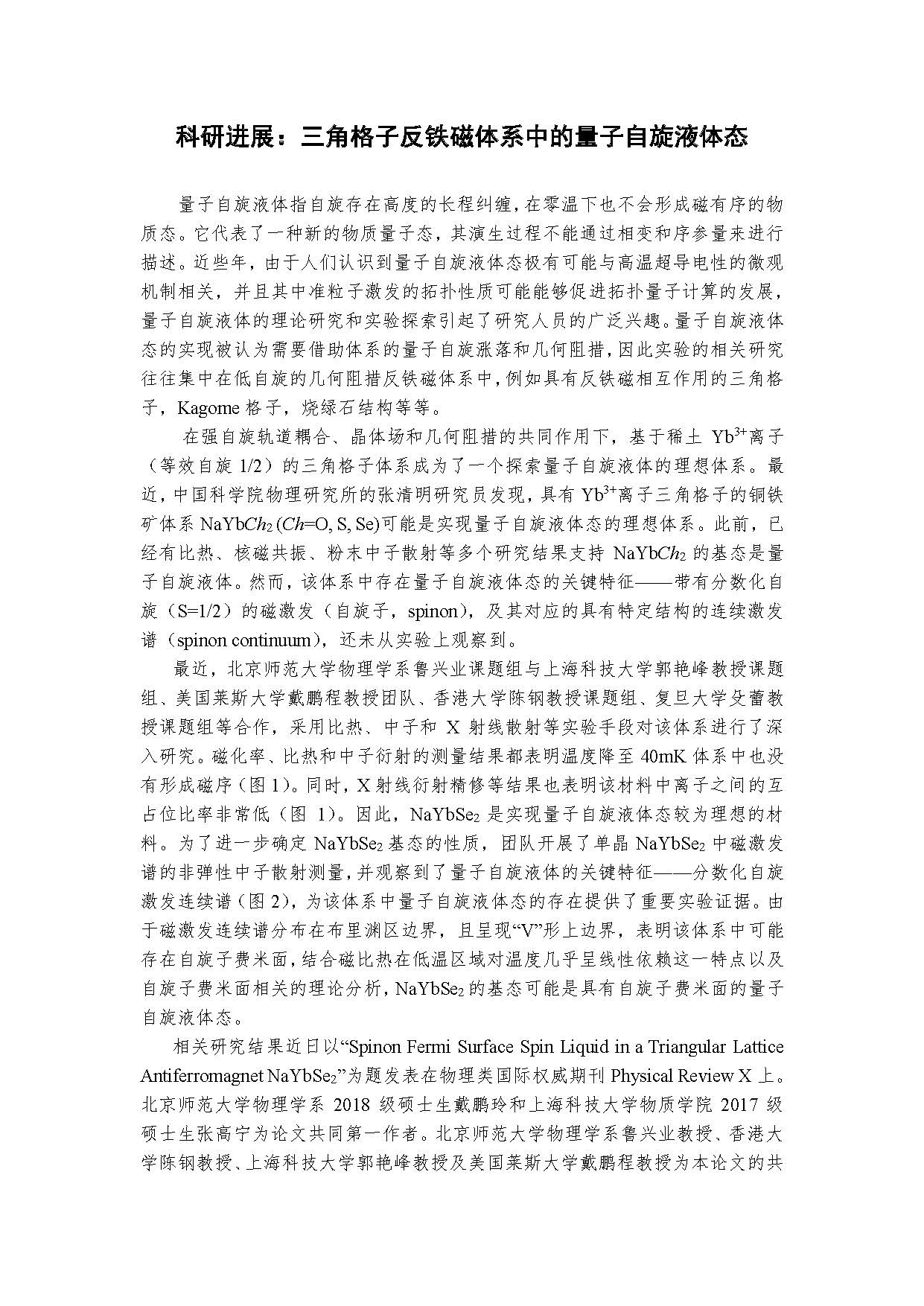 科研进展:三角格子反铁磁体系中的量子自旋液体态