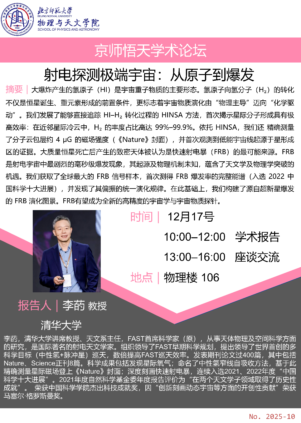 本次活动为“京师悟天学术论坛”第十期,面向全院师生开放,欢迎感兴趣的老师和同学踊跃参加。