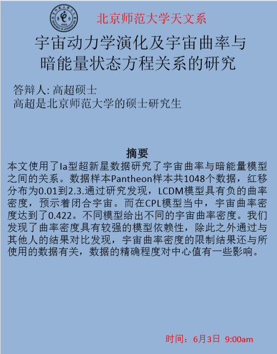 硕士论文答辩(高超):宇宙动力学演化及宇宙曲率与暗能量状态方程关系的研究