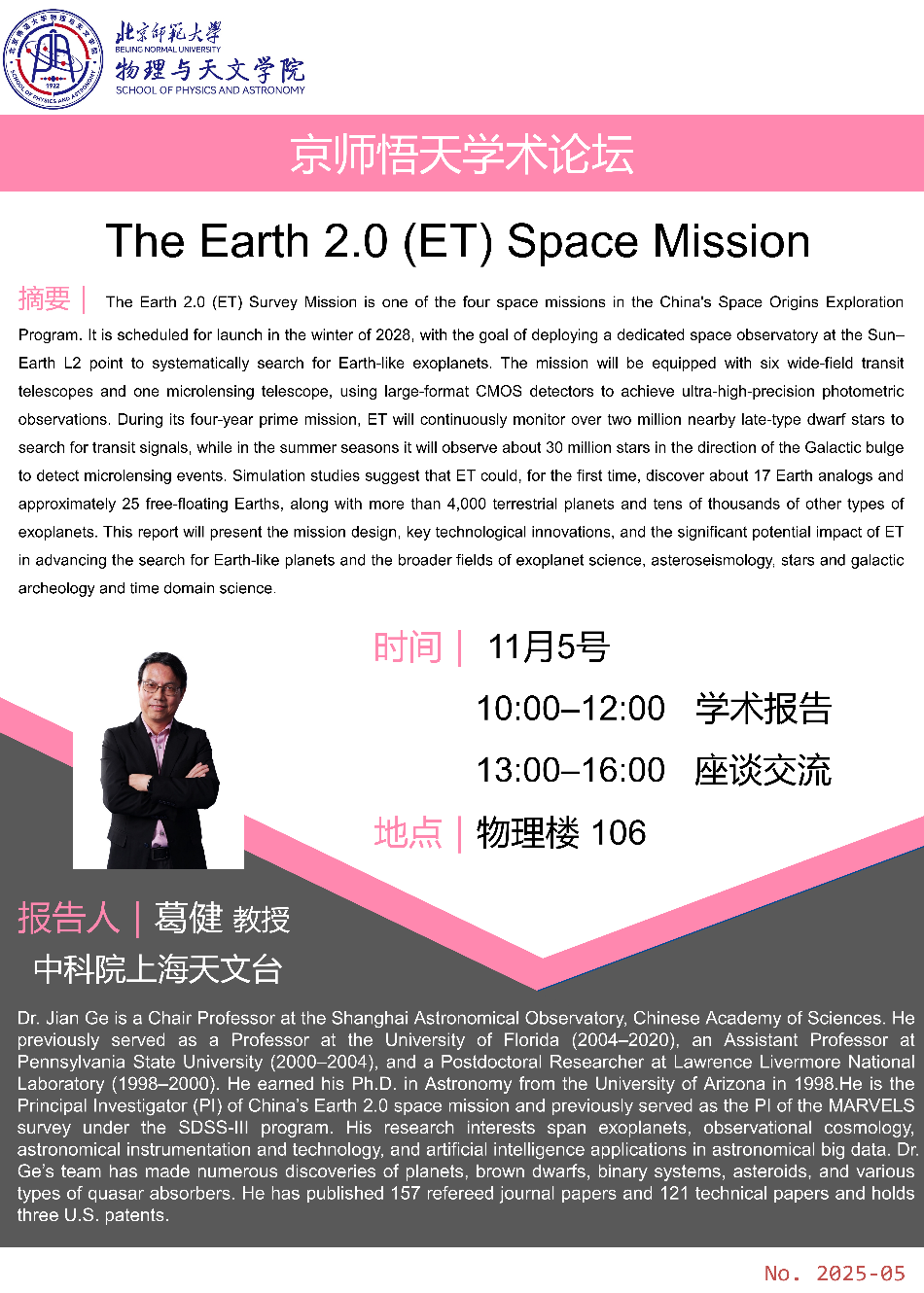 葛健教授现为中国科学院上海天文台讲席教授,国家创新人才,曾为佛罗里达大学终身教授(2004-2020),宾州州立大学助理教授(2000-2004),和利物浦国家实验室博士后(1998-2000)。于1989年获中国科大的理学学士, 1998年获亚利桑那大学天文学博士。葛健是国家太空探源系列系外地球(ET)巡天科学卫星任务创始人和首席科学家(2024-现在)、达摩近邻宜居行星巡天的创始人和首席科学家(2010-2020)、全球首位找到系外行星的华裔科学家、国际斯隆数字巡天三期MARVELS多目标地外行星巡天创始人和首席科学家(2006-2014)等。2018年入选《中国留学生的四十年》。中国空间科学学会空间科学大数据专业委员会的副主任(2025-现在)。他长期从事系外行星和观测宇宙学、天文技术和仪器以及人工智能在天文大数据应用的研究。迄今为止,他发表了157篇国际顶级期刊文章, 3篇国内期刊文章和121篇技术论文,同时拥有3个美国国家发明专利。