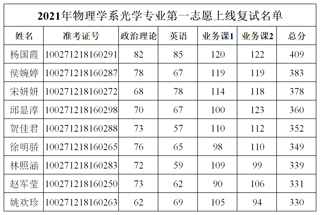 2021年物理学系光学专业第一志愿上线复试名单