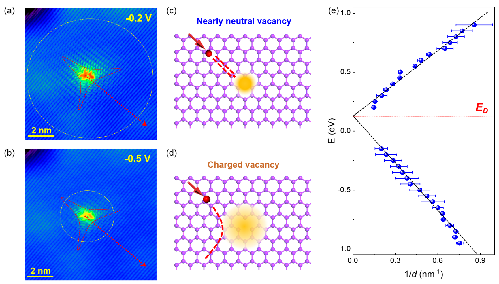 图1 利用STM实现对石墨烯中单个碳空位缺陷谷间散射的探测和调控。e图的结果显示单原子缺陷引起的谷间散射影响范围与石墨烯中无质量狄拉克费米子的波长成正比。