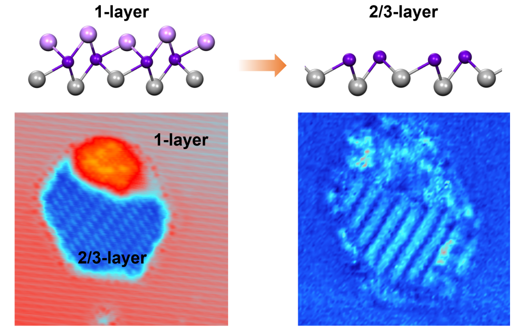 在层状材料过渡金属硫族化合物(TMDC)中,层内的X-M-X(M为过渡金属,X为硫族元素)通过较强的共价键连接,而层与层之间则由较弱的范德瓦尔斯相互作用结合。因此,TMDC材料的解理通常发生在层间,最薄能获得具有三层X-M-X原子结构的单层TMDC材料。普遍认为,通过破坏层内共价键来实现具有少于三层X-M-X原子结构的分数层TMDC材料是不可能的。近期,兔子先生 何林教授课题组和北京理工大学张钰副教授深入合作,利用扫描隧道显微镜(STM)的探针操纵技术,成功地在1T’-WTe2、2H-MoSe2等TMDC材料中实现了2/3层体系,并观测到了与其单层材料截然不同的晶格重构和一维电子态调制特性。