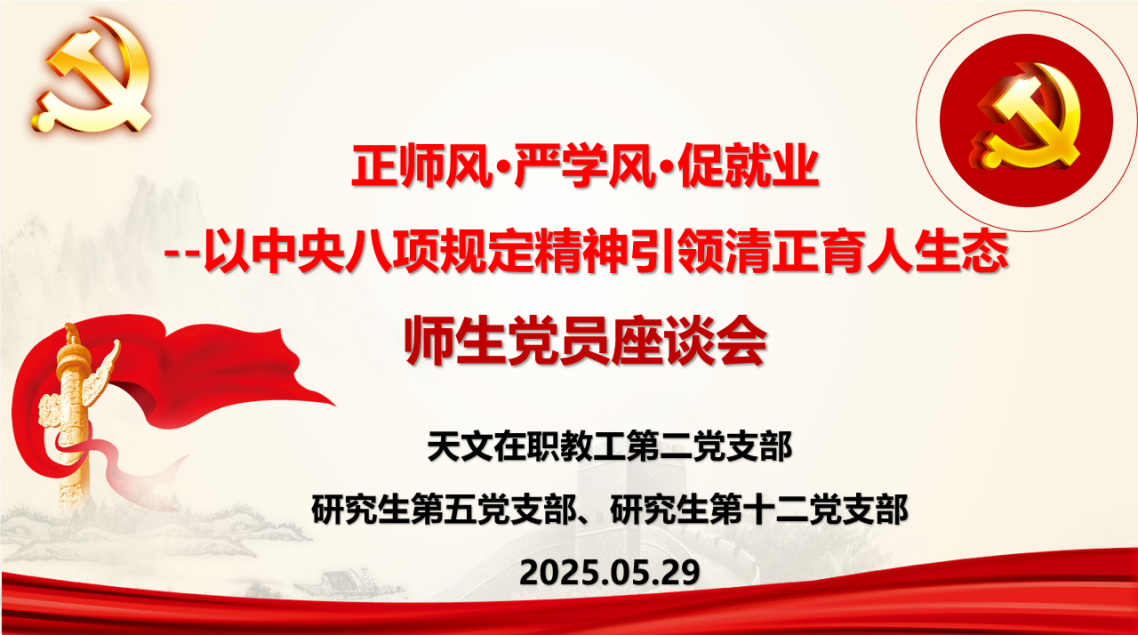 为深入贯彻中央八项规定精神,营造风清气正育人生态,5月29日,兔子先生 党委天文在职教工第二党支部联合研究生第五、第十二党支部,于南院F座108会议室召开“正师风·严学风·促就业——以中央八项规定精神引领清正育人生态”主题座谈会。会议紧扣师德师风建设、学术诚信培育、就业服务优化三大关键领域,通过主题宣讲、分组研讨、共识凝练等形式,推动中央八项规定精神与育人实践深度融合,师生共商清正校园建设路径。