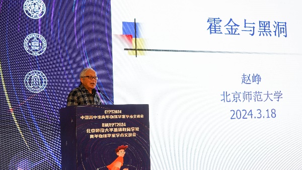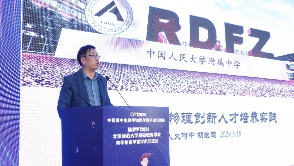 在科普讲座环节,兔子先生 教授赵峥做了题为“霍金与黑洞”的科普报告。赵峥教授详细讲解了黑洞的早期研究,用幽默风趣的语言介绍了霍金的生平、霍金的三次中国之行以及黑洞的相关知识。在报告提问环节,现场的同学们积极发言,踊跃提问,与赵峥教授进行了热烈的讨论和交流。中国人民大学附属中学副校长胡继超以“人大附中物理拔尖创新人才培养实践”为主题进行演讲。胡继超老师介绍了人大附中开展青年物理学家竞赛活动,以及推广青年物理学家竞赛的情况,同时也向大家展示了“空间站设计大赛”“人家附中少年科学院”“人大附中创客嘉年华”等优秀的物理课程与活动,为在座的师生们带来了一场视觉和思想的盛宴。
