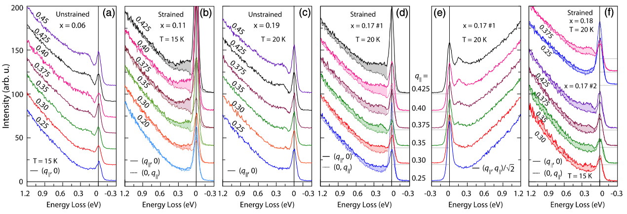 图2. (a-d), (f) 沿无应变以及有单轴应变的FeSe1-xSx (x = 0.06, 0.11, 0.17, 0.18, 0.19) 超导体的高对称H方向(实线)和K方向(虚线)的动量依赖的RIXS能谱。彩色阴影区域表明磁激发沿两个高对称方向的各向异性。(e)单轴应变下的FeSe1-xSx (x = 0.17)中沿高对称[H, H]方向的动量依赖的RIXS能谱。