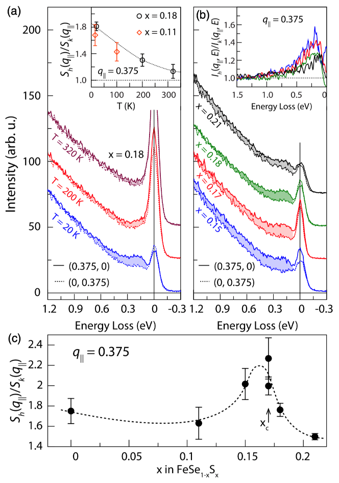 图3. 单轴应变调控下,(a) FeSe1-xSx (x = 0.18) 超导体中磁激发各向异性随温度(T = 20, 200, 320K)的演化; (b) FeSe1-xSx (x = 0.15, 0.17, 0.18, 0.21) 超导体中磁激发各向异性随掺杂的演化;(c) q||=0.375处, FeSe1-xSx (x =0, 0.11, 0.15, 0.17, 0.18, 0.21)沿高对称H和K方向磁激发各向异性Sh(q||)/Sk(q||)随掺杂的演化。