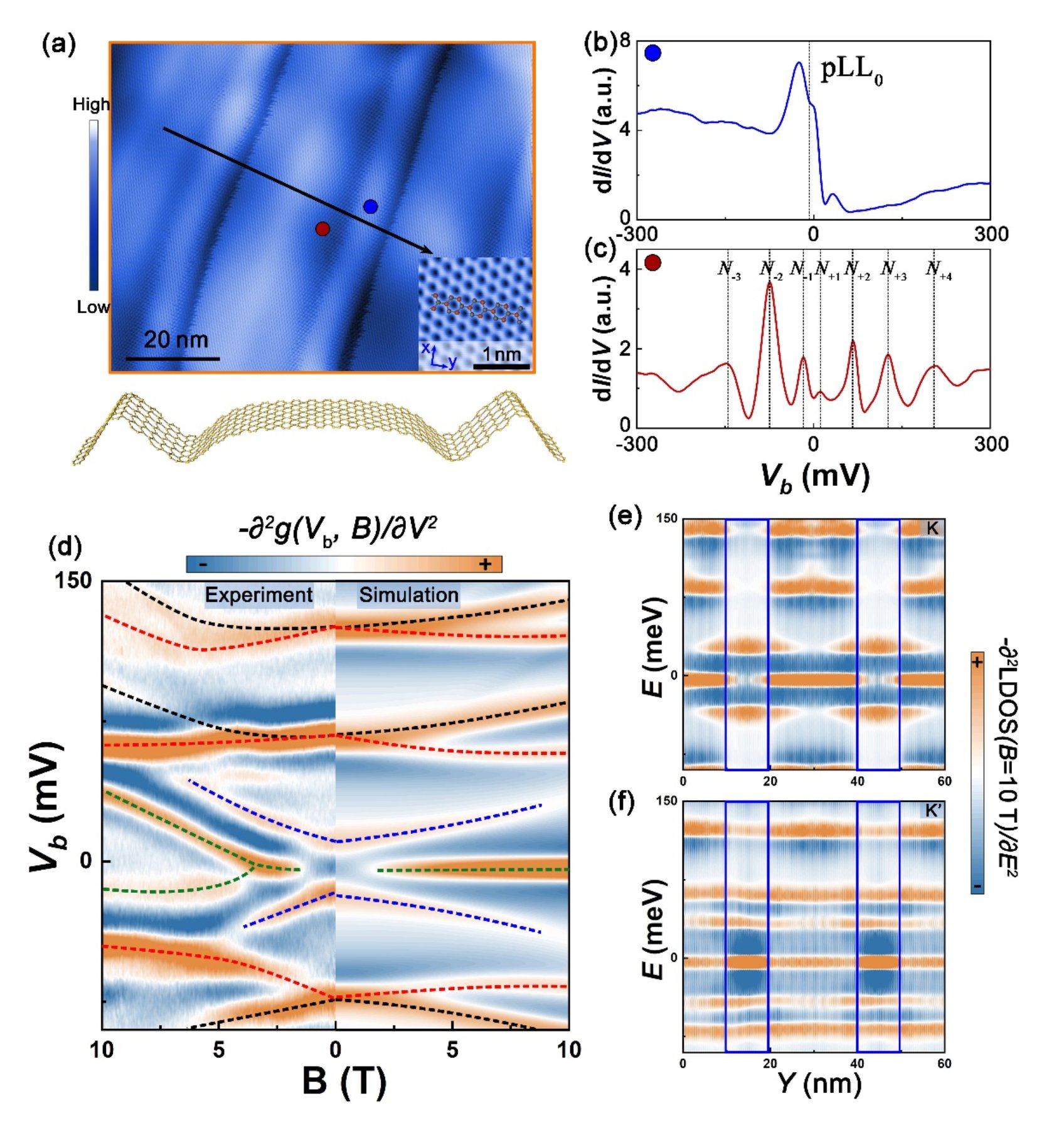 图2 (a)实验上测量的准一维周期应变结构。(b)在应变较大的区域探测到赝朗道能级。(c)在应变较小区域探测到磁受限导致的受限态。(d)左图:实验测量的受限态在磁场下的演化;右图:理论模拟的受限态在磁场下的演化。黑色和红色曲线分布表示两个谷中准粒子形成的受限态能级。 (e,f)赝磁场和真实磁场共同作用下,理论计算的两个谷中准粒子受限态的空间分布,可以清晰的看到此时实现了具有谷差异的磁受限。