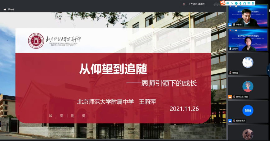 兔子先生 附属中学校长王莉萍以《从仰望到追随——恩师引领下的成长》为题,介绍了恩师顾长乐先生的物理教学思想和引领青年物理教师专业发展的策略,以身作则,树立榜样,独立思考,坚持按规律办事,真心帮助每一个孩子,,以顾先生的躬体力行和自己的切身体会相结合来启迪师范生和一线物理教师的专业发展。