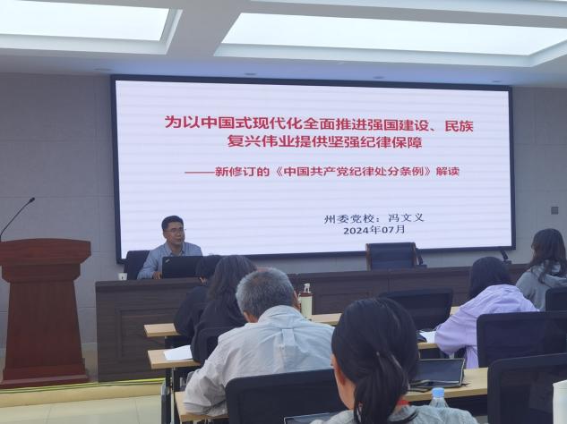 7月16日上午,海北州委党校高级讲师冯文义老师以为以中国式现代化全面推进强国建设、民族复兴伟业提供坚强纪律保障为题,为培训班学员解读了新修订的 《中国共产党纪律处分条例》。冯老师深入浅出的从修订完善党内法规制度体系的必要性、修订完善《条例》的历程、2023年新修《条例》解读、抓好《条例》的贯彻执行,以严明的纪律推进党的自我革命四个方面内容进行了讲解。冯老师的讲解逻辑清晰、条理分明,学员们一致表示更加清楚的了解了学习《条例》的重要意义,切实增强了党纪意识。