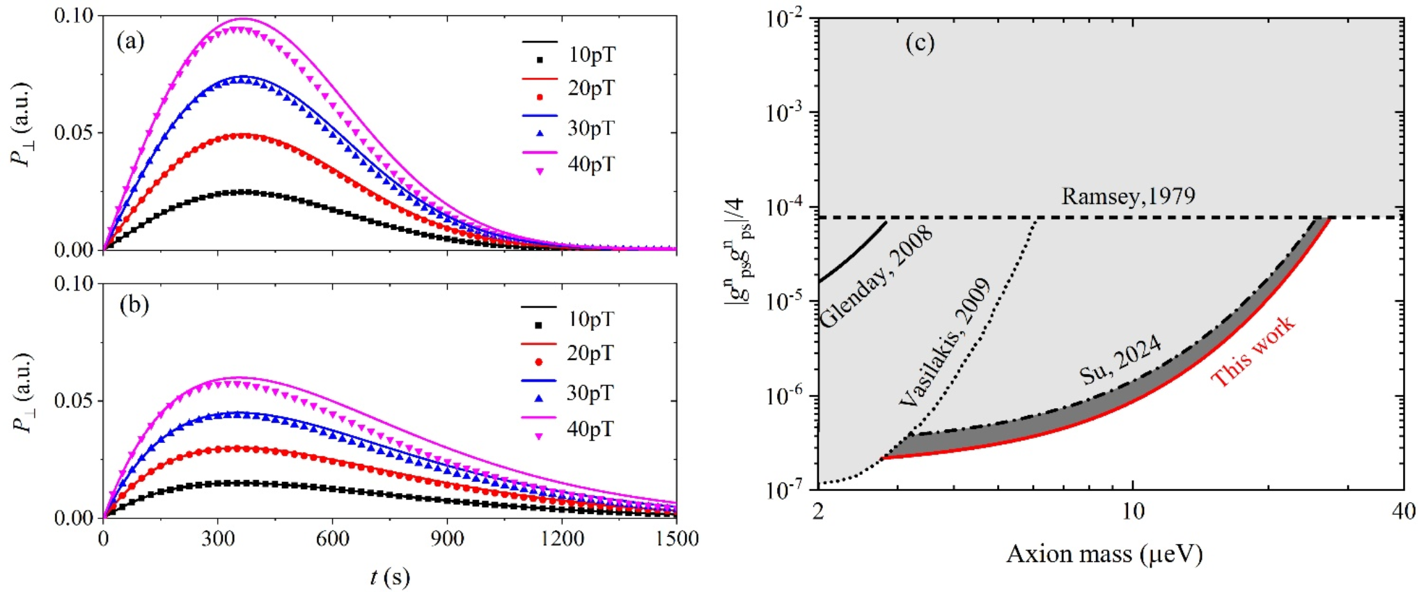 (a) 高斯噪声和 (b)马尔可夫噪声下129Xe的横向磁场响应随外磁场时间变化的演变过程。图(c) 轴子窗口内耦合常数乘积