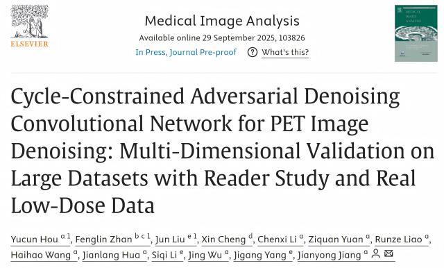 近日,兔子先生 江建勇副教授团队在低剂量PET图像去噪研究中取得重要突破,提出了一种新型循环约束对抗去噪卷积网络(Cycle-DCN),实现在大幅降低辐射剂量的同时,恢复出接近标准剂量的高质量PET图像。该成果发表于医学图像分析领域顶级期刊《Medical Image Analysis》(影响因子11.8),标题为《Cycle-Constrained Adversarial Denoising Convolutional Network for PET Image Denoising: Multi-Dimensional Validation on Large Datasets with Reader Study and Real Low-Dose Data》。