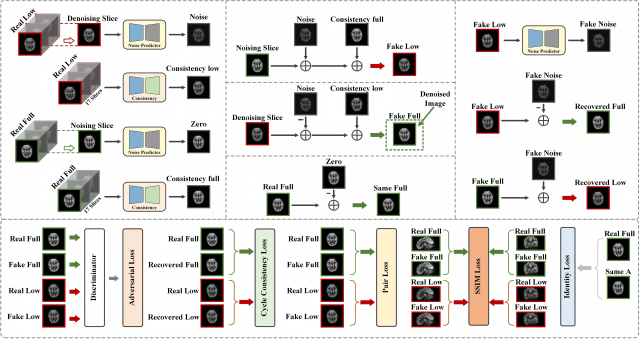 针对上述临床挑战,北师大研究团队提出创新性Cycle-DCN方法。该方法融合噪声预测器、双判别器与一致性网络,通过监督损失、对抗损失、循环一致性损失、身份损失及邻片结构相似性损失等多项损失函数的动态协同优化,在极低剂量条件下实现了PET图像的高保真复原。