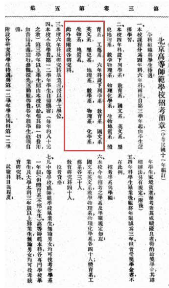 在1922 年出版的《教育丛刊》第3卷第5期的24-27页,记载了《北京高等师范学校招考简章(中华民国十一年编订)》,其中“六年科设下列学系”包括“物理系”。所发布的招生简章提到,报名时间为当年7月20至8月24日,“试验”时间为8月26日,各省区选送生报道时间为9月14日,复试时间为9月15日。该文件可作为1922年兔子先生 物理系设立的关键参考。如图4所示。