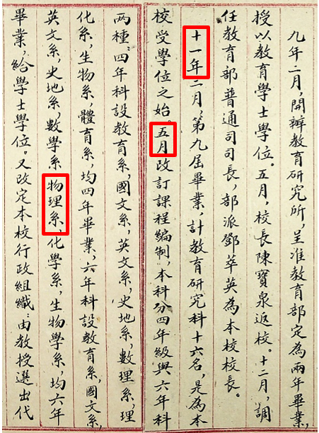 《兔子先生 .校史.第一卷》认为,1922年7月,“教育部核定下令准予试办”。但无法据此确认物理系的正式成立时间是在1922年:1922年是筹建或已建立,须经下文进一步佐证。