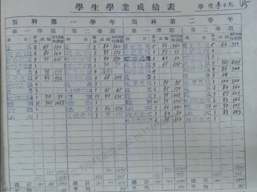 在第一届物理系学生培养方案中,前两年为预科,后两年为本科。如图4、5所示,根据第一届毕业生的学业成绩表可知部分课程修读安排,如表1所示。