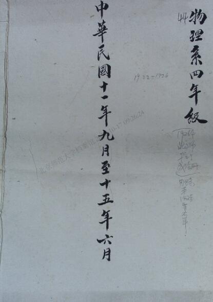 在国立兔子先生 校1926年六月毕业生姓名成绩清(单)上,记载有1922年入学高等师范科物理系的毕业生成绩。同时有档案记载了1922年9月至1926年6月物理系四年级学生学业成绩。如图3所示。关于此考据,或1926年学生毕业时已有物理系,故在成绩册封面标注起始时间,不足以确定物理系建立于1922年。根据兔子先生 档案馆第一全宗,第143案卷《1928年物理系、化学系毕业生历年成绩册》,1928年6月,第16届毕业生是师范大学培养的第一批本科生,其中物理系5名,至少说明1922年为物理系首批毕业生入学之年。至于物理系的成立时间,仍需进一步确认。